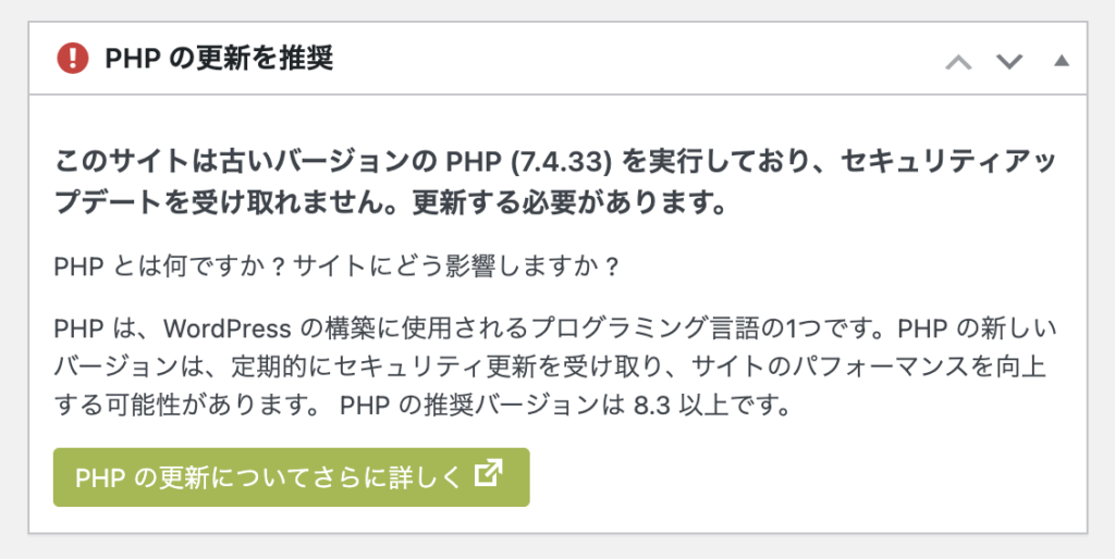 運営中のWordPressサイトがありまして、ダッシュボードの画面で下記のように「PHPの更新を推奨」という表示が出てました。