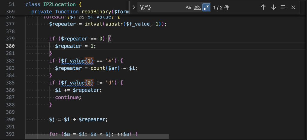 「wp-content/ip-geo-api/ip2location/IP2Location.php」の該当ファイルを開きまして、私の相棒「VSCode」ちゃんに貼り付けそれらしい箇所を検索。