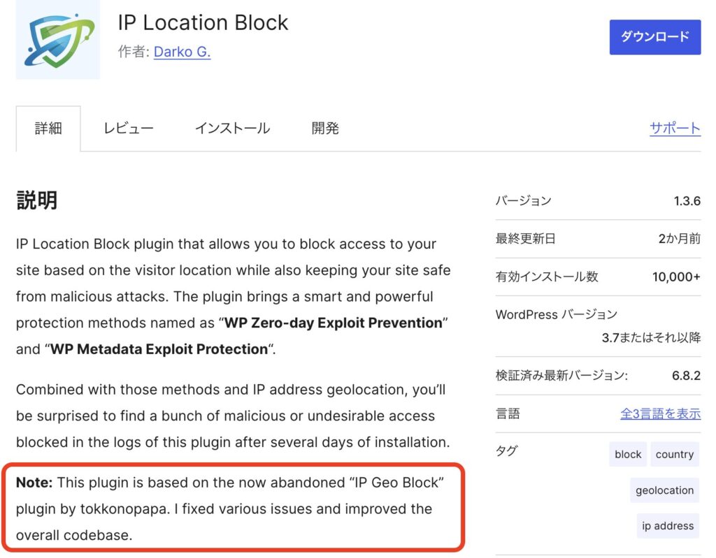 どうやら下記2サイトを見る限り「IP Geo Block」をベースに問題点などを改善した「IP Location Block」という後継のプラグインがあり今はそちらがアップデートされている様子。