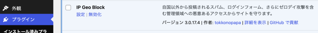 プラグインのタブで「IP Geo Block」を無効化します。