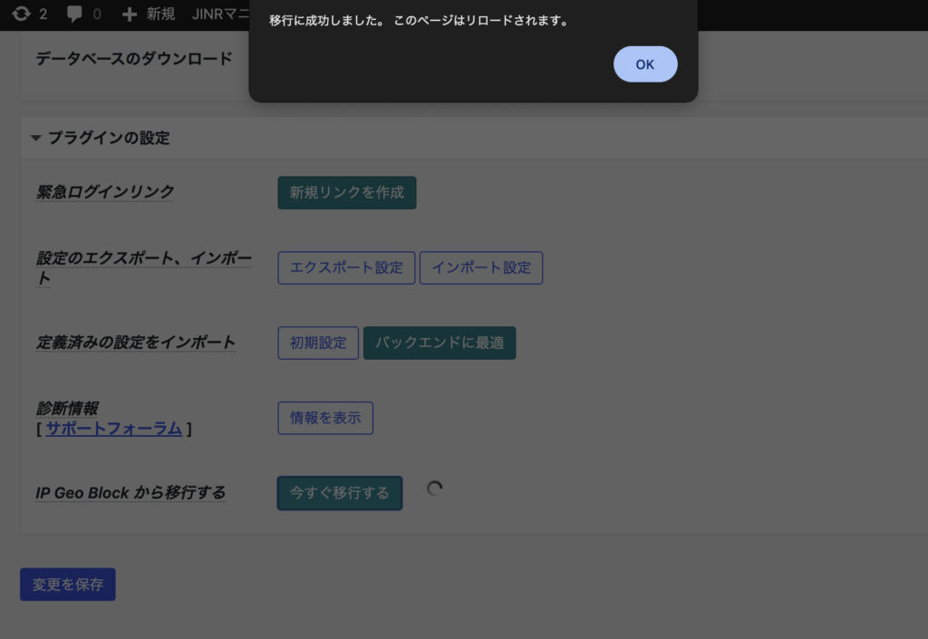 またプラグインサイトにもありますが”Migrate from IP Geo Block”という設定を移行する項目が表示されるらしく「IP Geo Block」を消すのは最後が良さそうです。