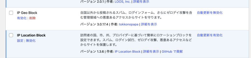 無事管理画面にログインできるようになったため「IP Geo Block」から後継の「IP Location Block」へ切り替えておきます。変更手順は下記の通りです。